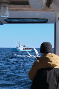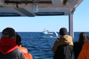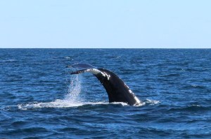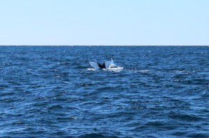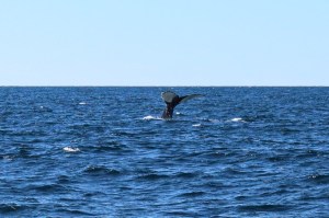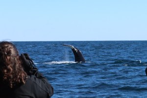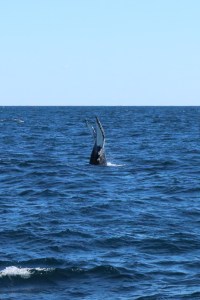 After about a 2 hour boat ride, we made it to the spot the previous boat had spotted a whale. We sat there for about 20min or so waiting to see if we could spot anything. Then finally a whale crested, turned belly side up and slapped its fins on the water.